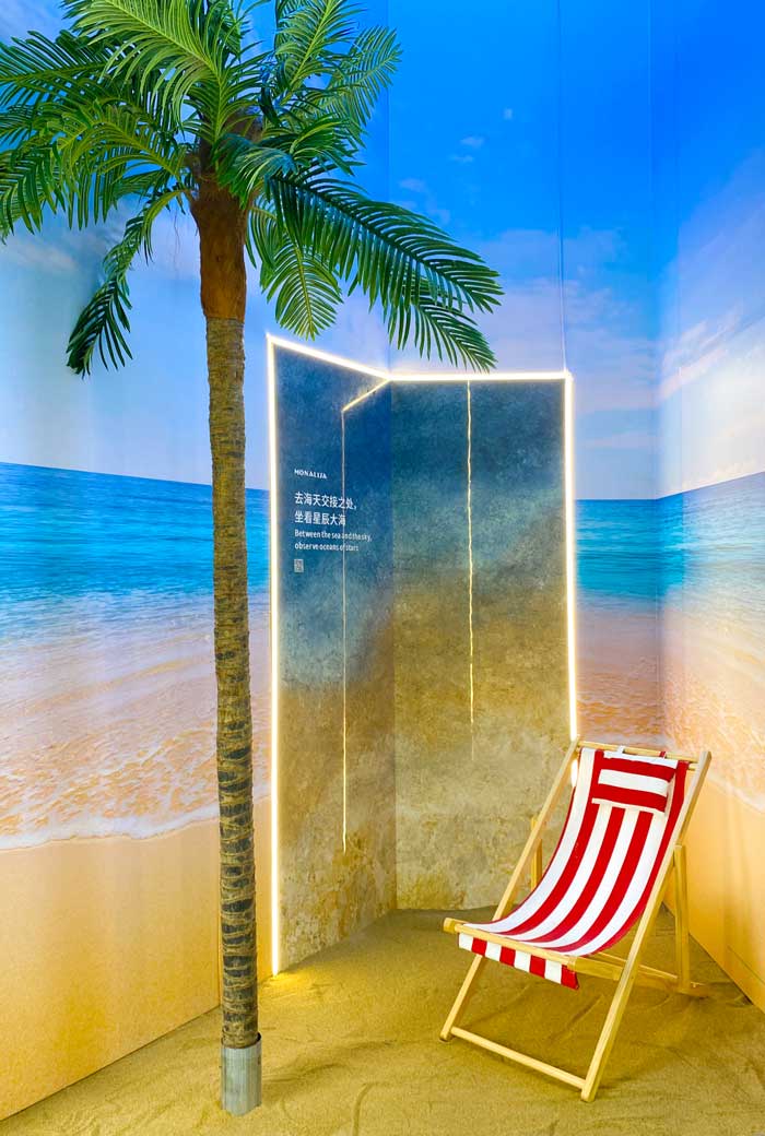 3.6米高的“大漠流金”“诺曼底棕”超大规格陶瓷大板与6片一组的“布鲁蓝”大连纹地面,组合成大漠丘壑奇景。