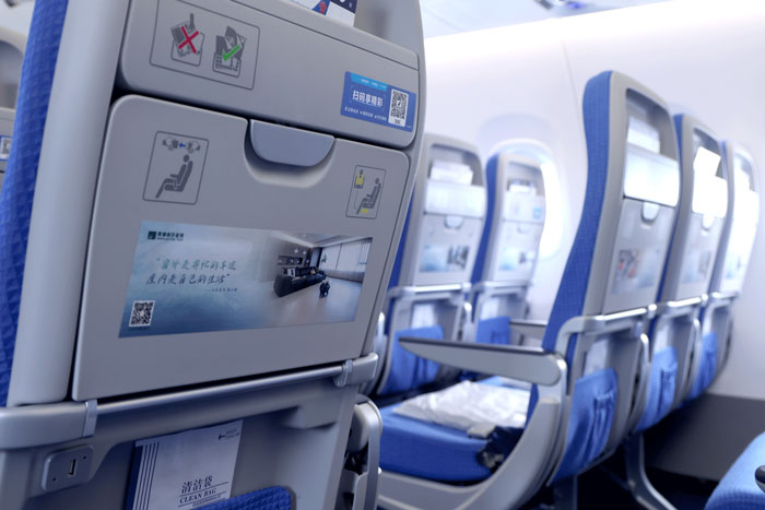 舒适的南航C919客舱内,极具蒙娜丽莎品牌特色的标识、广告,打造出特殊的空中艺术空间,形成无与伦比的空中美学体验。