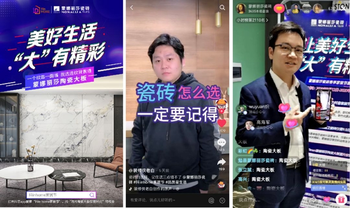 2020年开春,蒙娜丽莎瓷砖全面发力“抖音”短视频营销,不仅联合抖音平台重磅推出“抖in home家居节”,打造蒙娜丽莎瓷砖抖音家居特惠场;更联合全国千家门店发起抖音挑战赛,千万播放次数发出品牌最大声量;还组织策划了一场抖音直播互动,吸引千名粉丝在线参与,成功解锁抖音营销新玩法!