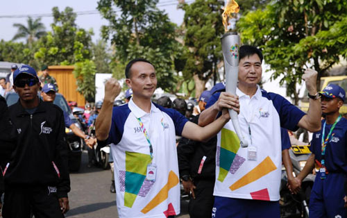 ▲蒙娜丽莎集团总裁萧礼标、副总裁邓啟棠传递亚运火炬