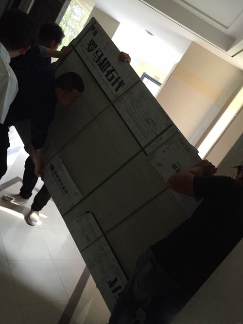 这么超大规格的陶瓷厚板,其送货、安装的过程也值得大书特书。42日,蒙娜丽莎瓷砖芜湖销区员工对这一天印象深刻,因为第一次将超大规格产品送货安装,品牌部所有的男员工都到了现场,还提前准备了吸盘、切割机、打包带、大理石胶等工具和材料。送货之前,为避免磕碰和绷瓷,物流部规划用废旧木工板打底,固定单片大板的方法,以确保大板完整无缺的送达。