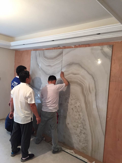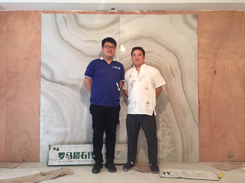 当罗马超时代陶瓷大板送货到公园大道小区时,正在装修的小区内引发了一场不小的轰动——竟然有这么大一片的瓷砖,引得小区内业主纷纷驻足围观。随行的家居顾问不忘现场介绍,宣传陶瓷大板的卖点?;跆菘占渥愎淮?,两片大板得以快速、顺利送达客户家中。大板的安装同样牵动着现场人员的心,即使是从事瓷砖销售多年的人都未曾亲历过这么大规格大板的安装,加上客户房子层高较低,除去天花只有2.3米,还需切割10公分,现场切割是否可行,效果会不会有什么影响?通过几次方案评估和预演,经验丰富的王师傅现场切割,过程堪称完美。在客户和员工的共同努力下,两块大板顺利安装到位,效果非比寻常,客户十分满意!