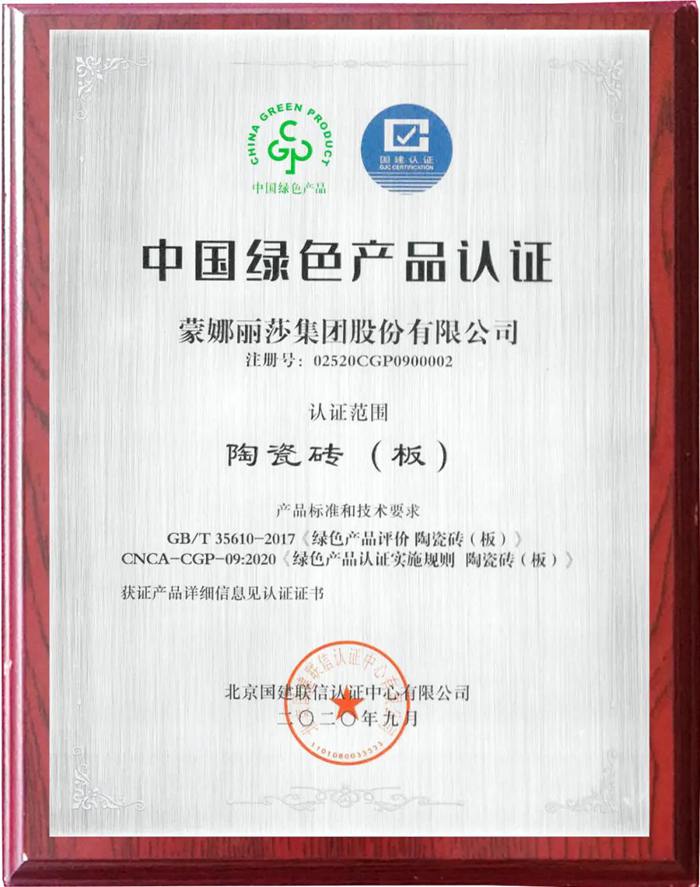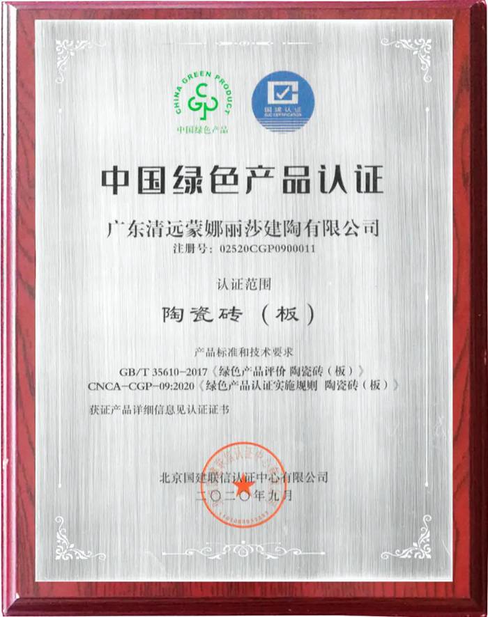 中国绿色产品认证是按照《国务院办公厅关于建立统一的绿色产品标准、认证、标识体系的意见》(国办发〔2016〕86号)文件要求,按照统一目录、统一标准、统一评价、统一标识的方针,将现有环保、节能、节水、循环、低碳、再生、有机等产品整合为绿色产品。据悉,目前国家人监委正式批准国检集团“中国绿色产品”认证资质,率先覆盖陶瓷砖(板)、卫生陶瓷、人造板和木质地板、涂料、防水和密封材料、建筑玻璃、绝热材料、家具、木塑制品、纸和纸制品、纺织品等建材、家居领域11个类别,其中蒙娜丽莎集团股份有限公司、广东清远蒙娜丽莎建陶有限公司的陶瓷砖(板)均获得首批颁发的“中国绿色产品认证证书”。