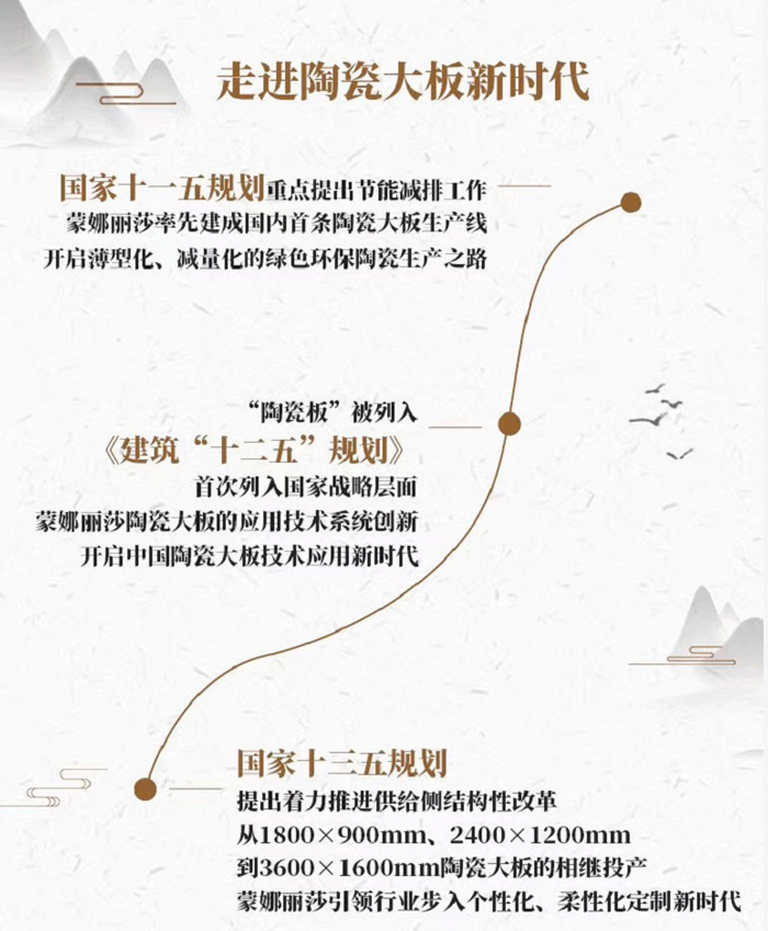 2007年,蒙娜丽莎主动接过新时代建筑陶瓷新发展的“接力棒”,以积极行动响应国家十一五、十二五、十三五时期号召,并取得阶段性进展,推动行业及社会实现高质量发展。