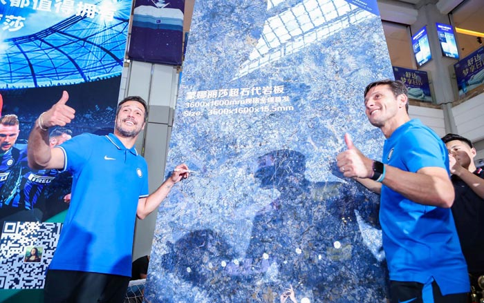 25日下午,由蒙娜丽莎瓷砖主办的国米球星见面会在南京红星美凯龙卡子门商场举行,蒙娜丽莎集团董事、副总裁邓啟棠,红星美凯龙集团助理总裁白杨,国际米兰国际商务总监Tal Moriah等领导嘉宾出席了本次活动。带着双方友谊长存的美好寓意,蒙娜丽莎集团董事、副总裁邓啟棠与国际米兰国际商务总监Tal Moriah在现场交换了礼物。随后国米传奇球星萨内蒂和塞萨尔现身,在活动现场展出的蒙娜丽莎3600×1600mm大板新品上签字留念,并亲临蒙娜丽莎门店体验产品的独特魅力。