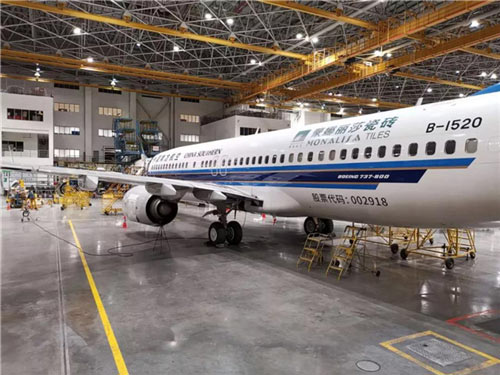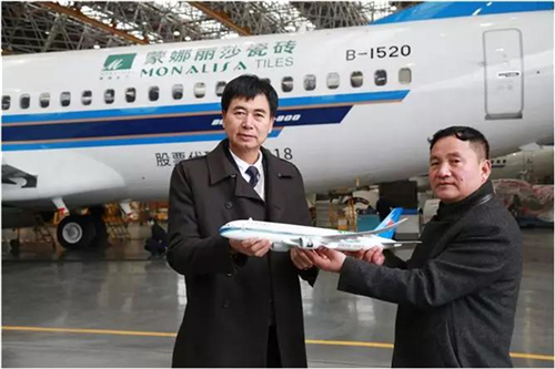 12月30日,蒙娜丽莎集团携手中国南方航空公司联合打造的“蒙娜丽莎瓷砖号”主题飞机在广州GAMECO机库(广州飞机维修工程有限公司)揭幕亮相。蒙娜丽莎集团及经销商代表和南航代表一同见证了本次亮相过程。