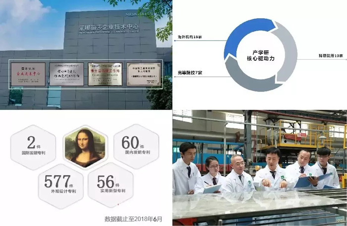 蒙娜丽莎集团建有四大省级以上的科技创新平台,成功申请国家及国际专利累积超过695项,推动企业在行业革新中屡屡领先;与众多高校、研究院、外企建立产学研合作,在战略发展、专家智库、陶瓷材料研发等方面进行深入交流;并致力于培养优秀科研人才,有效推动陶瓷行业相关核心技术的解决,成为企业产品创新、生产创新的不竭动力。