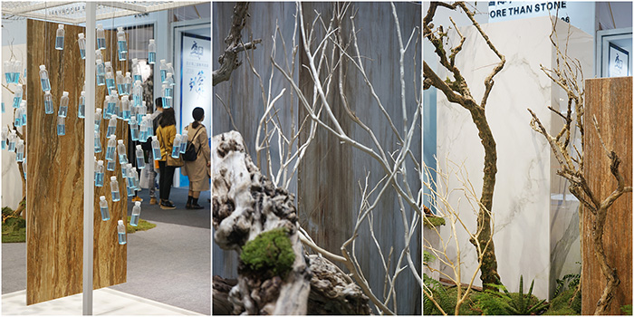 没有富丽堂皇的门头,不见一尘不染的样板间,只有清脆的虫鸣鸟叫和模拟生态的环境布置,让蒙娜丽莎的展位在一片展商中显得格外宁静、个性十足。展位设置环境装置,以多元的形式进行产品展示,在场地中搭建出了沙丘、绿洲、石林和湖泊的概念场景,打造出充满自然气息的空间。多款明星产品置身其中,与不同的地形主题对应,移步换景,凸显产品源于自然又能和自然和谐相融的理念。