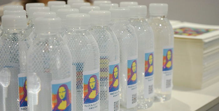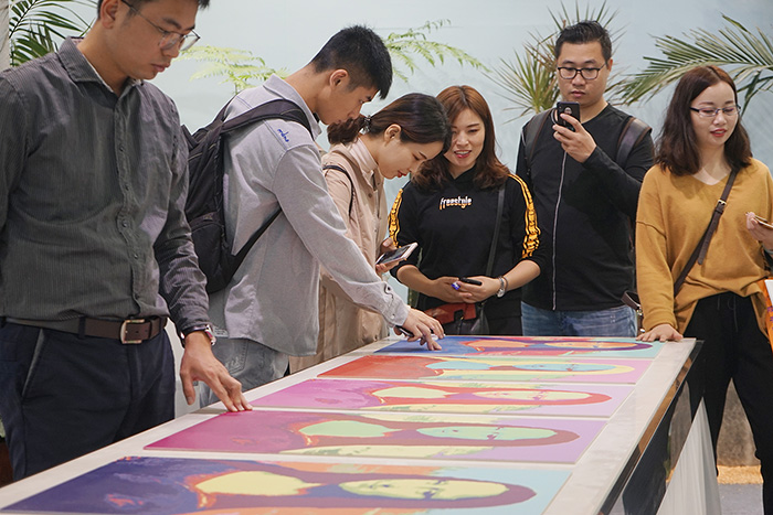 观众靠近端详蒙娜丽莎波普瓷艺画并感受其触感