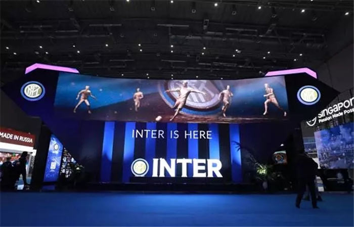 蓝黑色为主色调的国米展位,造型独特,以创意性与高科技感为来宾讲述一个百年俱乐部的传奇故事,讲述国际米兰与中国的渊源,这其中当然少不了国际米兰与蒙娜丽莎的故事。