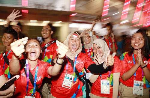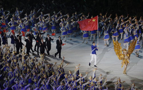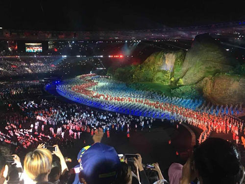 在隆重的启幕表演后,各国运动员代表团旋即进入体育场表演台上。印尼少女身着金色盔甲礼服,身背金色羽翼,引导各代表团依次入场。中国跆拳道运动员赵帅高擎五星红旗,身着”蓝色梦想”引领中国体育代表团入场。中国香港、中国澳门、中国台北代表团也分别入场。东道主印尼运动员代表团最后压轴入场时,全场爆发出最长时间的欢呼。
