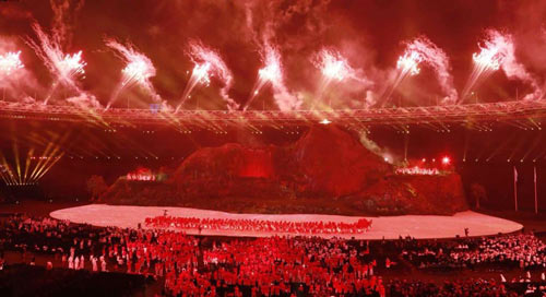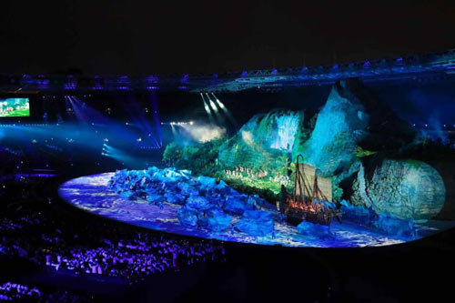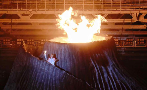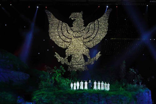 当晚,在全场观众的注视下,印尼著名运动员依次传递火炬,从舞台一路走上高山,当印尼羽毛球名将王莲香最后接过火炬,在舞台的火山之上,圣火点燃宛如火山喷发,现场一片沸腾,点燃全场最高欢呼声。