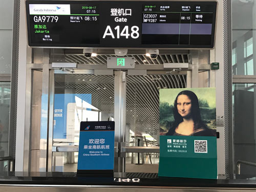 航班出发前,蒙娜丽莎集团联合南方航空举行了简短的送机仪式。乘客们身着醒目亮丽的定制服装,一早便在白云机场集结完毕,随后蒙娜丽莎集团副总裁邓啟棠和南方航空相关负责人互换了纪念品,航班正式起飞前往雅加达。