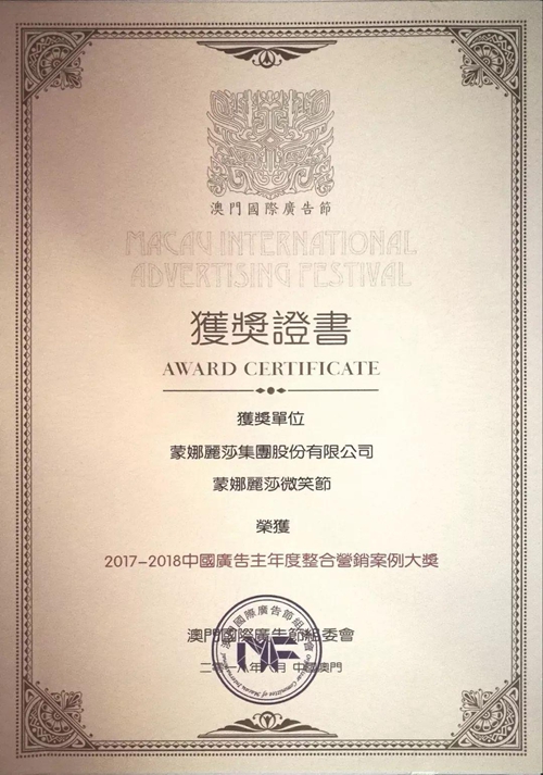 本届广告节对为实业、传媒业、互联网业、广告界等作出重大贡献的行业精英、营销案例、传播机构、广告公司、制作公司及大家最喜爱的品牌进行表彰。其中,蒙娜丽莎集团凭借“蒙娜丽莎微笑节”品牌活动,获颁“2017-2018中国广告主年度整合营销案例大奖”,得到广告业界对企业品牌建设的高度肯定。