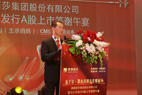 8:58,一个吉祥的时刻,上市仪式正式开始。南海区副区长乔吉飞、上市保荐机构招商证券投资银行总部董事总经理王炳全、蒙娜丽莎集团董事总经理萧礼标先后上台致辞,充分肯定了蒙娜丽莎集团近年来出色的经营业绩和良好的发展态势,并对蒙娜丽莎集团上市后的发展寄语厚望。乔吉飞在致辞中指出:“蒙娜丽莎成功上市后,南海区拥有的上市企业已达16家。这个成绩标志着南海制造的实力在不断攀升,南海企业家的资本运营意识也正在不断加强,越来越多的本土制造企业渴望进入资本市场。”
