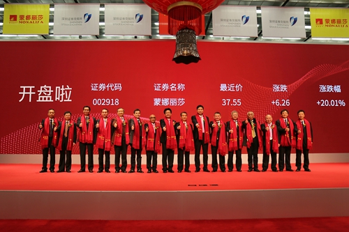 2017年12月19日上午,中国建筑卫生陶瓷行业优秀企业——蒙娜丽莎集团股份有限公司在深圳证券交易所正式上市,股票名称“蒙娜丽莎”,股票代码:002918,成为佛山陶瓷行业第一家在A股市场上市的企业,也是广东省第一家在A股上市的建筑陶瓷企业。