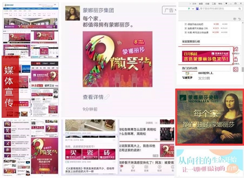 第九届蒙娜丽莎微笑节通过大面积高强度全覆盖的密集型媒体广告投放,传递强大的品牌实力的同时,激发用户对蒙娜丽莎瓷砖品牌的认知。