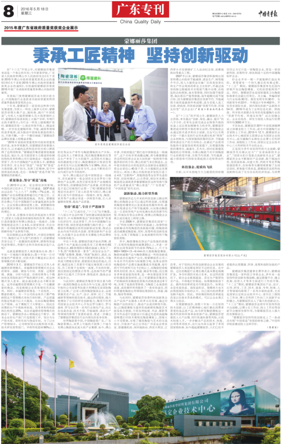 2016年5月24日下午,广东省质量大会在广州召开,省委书记胡春华主持会议并讲话,强调要把质量强省作为一项长期战略坚定不移推进实施,全面提升发展质量效益。国家质检总局局长支树平、省长朱小丹、省委秘书长邹铭、副省长何忠友、袁宝成等领导以及包括蒙娜丽莎集团在内的获奖企业代表出席本届质量大会。