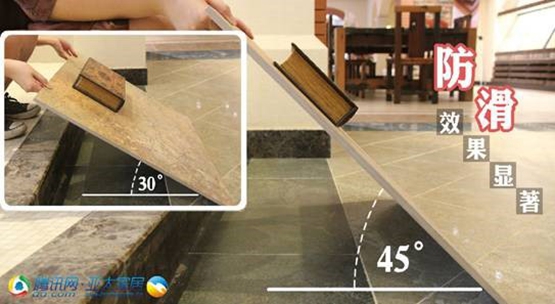 在腾讯的评测中,将一封面光滑的书置于拉菲经典仿古砖砖面部分,并不断倾斜角度,从10° 迅速抬到 30°,书本都纹丝不动,像钉在瓷砖表面上,直到瓷砖倾斜 45° 的时候书本仍然hold住在瓷砖表面上,止滑效果非同一般。