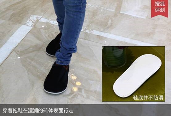 搜狐测评人员往砖面倒水,穿着毫无止滑处理的平底拖鞋在湿润的砖体表面行走,并表示:在砖体表面行走时,可以感受到一股磨擦力,就算在湿润的砖体表面行走,依然能够行动自如,不受影响。为了进一步测试砖体的止滑性,评测人员决定做一个实验:将砖体呈现45度角倾斜,将一个纸杯放置砖面上方,并倒水使其掉落。实验中,明显地看到纸杯被水冲刷时,反而与砖面的摩擦力更强,更加不易掉落,遇水更加止滑。