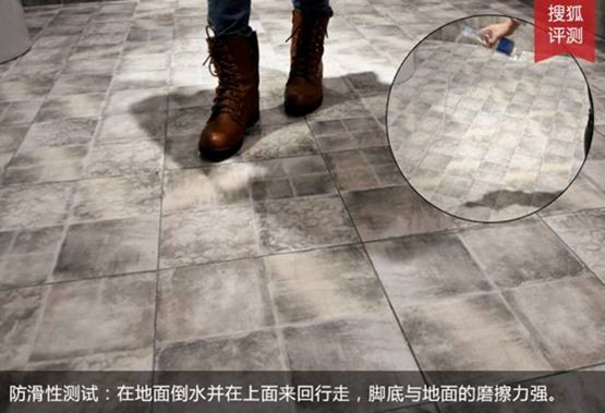 对于厨卫空间的产品,蒙娜丽莎瓷砖的止滑性能更带优势。在1506系列小砖测评中,搜狐测评人员以同样的方式,通过模拟日常生活中被打湿的地面,亲自感受地面止滑性。