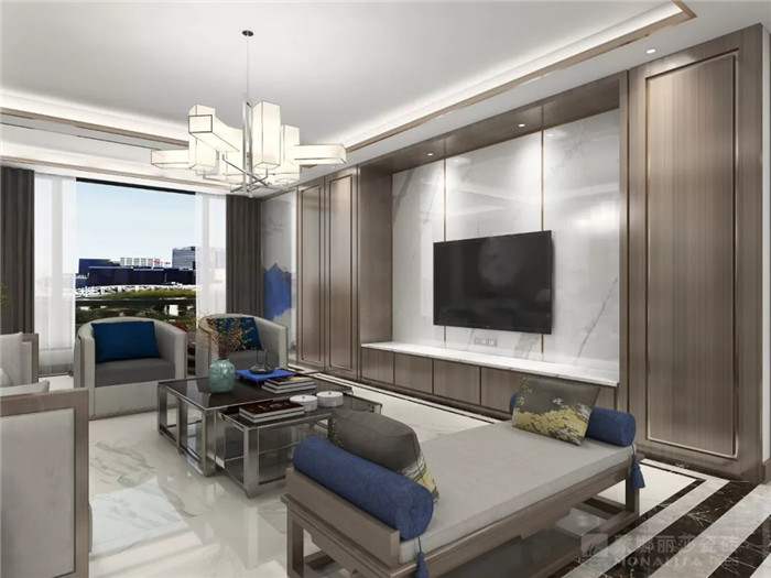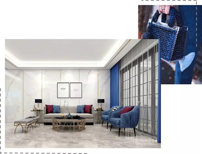 2019年蒙娜丽莎尝试让这种高调的蓝突破软装材质的界限,融入大理石瓷砖的设计中。用独一无二的石材纹理让蓝色更添优雅贵气,给空间注入宫廷般的“高冷”气质。