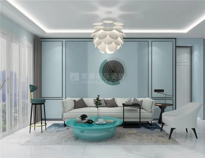 在蓝色系中,清水蓝特别适合用在家里,它比深蓝淡薄,比淡蓝沉稳,无论作为墙色、墙砖,还是软装搭配,都能保持空间的清爽,仿佛尽情奔跑于蓝天大海的交界之处。