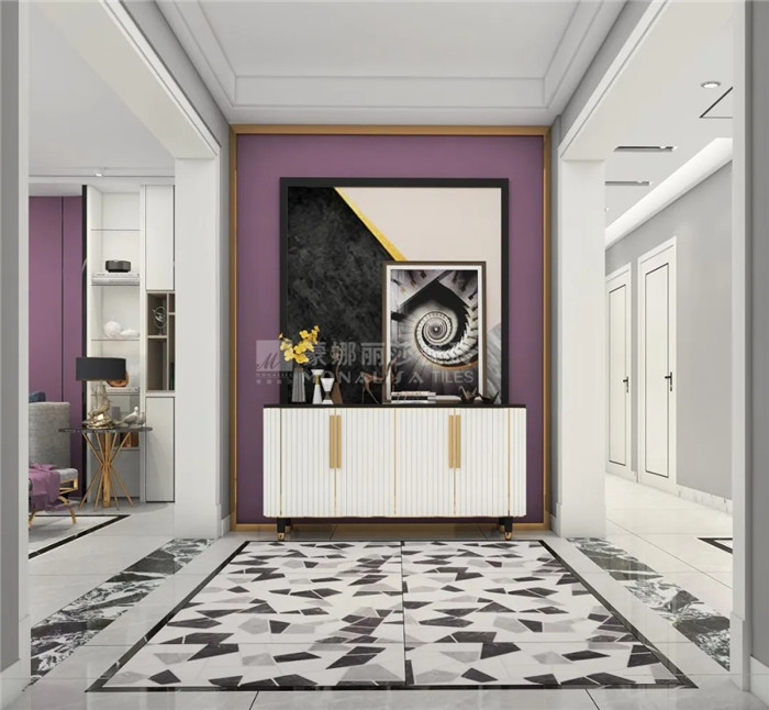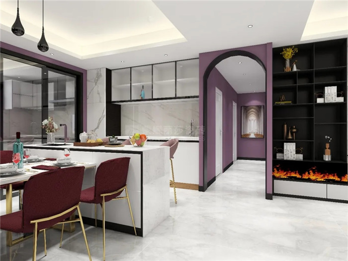 黑加仑紫属于暗色系,与大规格的白色仿石瓷砖搭配能够保证空间的亮度,提升家居活力,彰显贵族不凡格调。