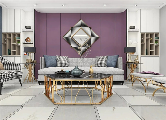 浓郁的紫色调搭配大理石纹理,营造出优雅的现代空间。搭配金属材质家具,带有复古雅致的格调。