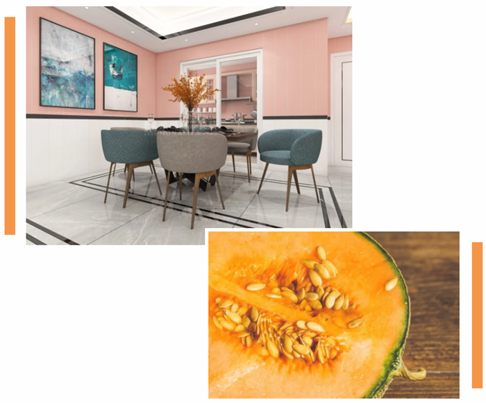 将蜜瓜橙装饰在家中的墙面上,不管是大面积的使用,还是作为配色,都能让我们感受到甜蜜与温馨。与灰色系仿石瓷砖的结合,形成冷暖色的对比,让空间充满活力而不张扬。