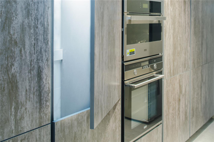 岩板作为橱柜面板,有着细腻的质感、柔韧耐磨的表面、多变的颜色以及透光的材质,防潮耐用,无惧油腻困扰。普通橱柜面板,使用一段时间之后,总觉得有点粘手,即便是用洗洁精进行了清洗,效果总是不明显,岩板橱柜可以很好解决这一难题。