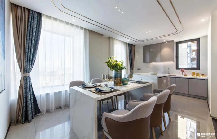 厨房为开放式设计,陶瓷大板的桌台,让空间感觉更干净整洁。