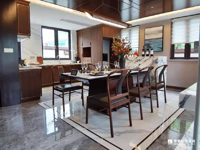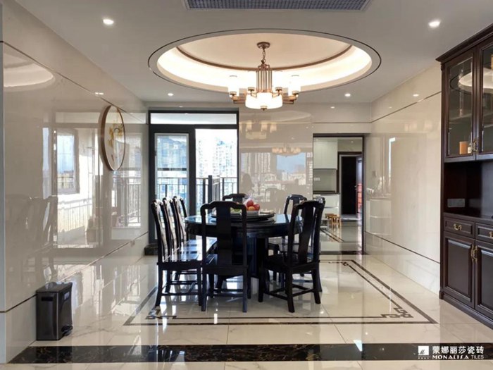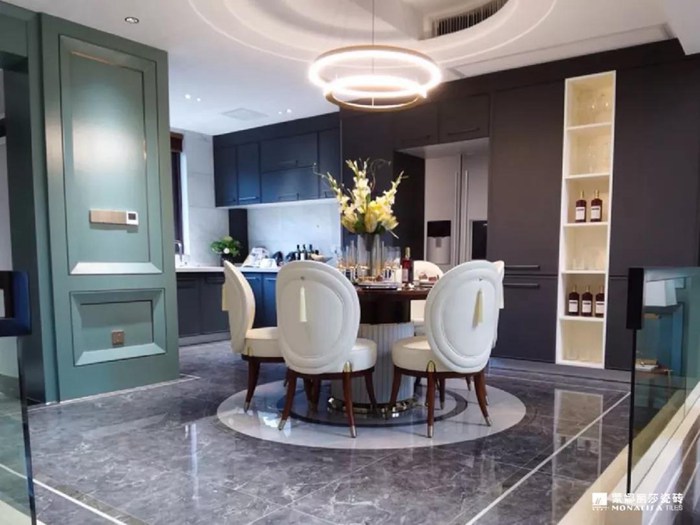 从客餐厅到茶室均采用灰白色的两款罗马宝石搭配,整体十分自然时尚。