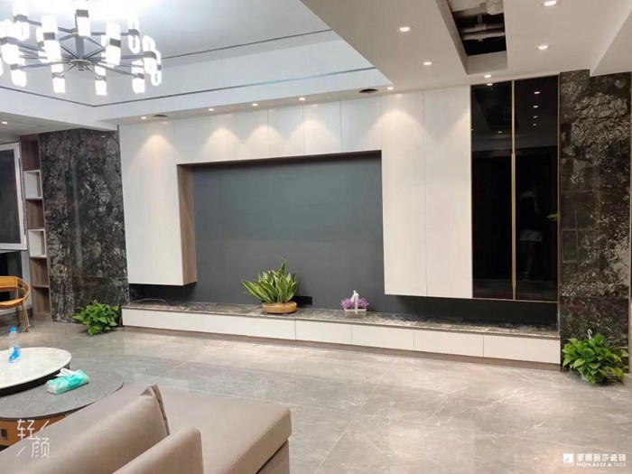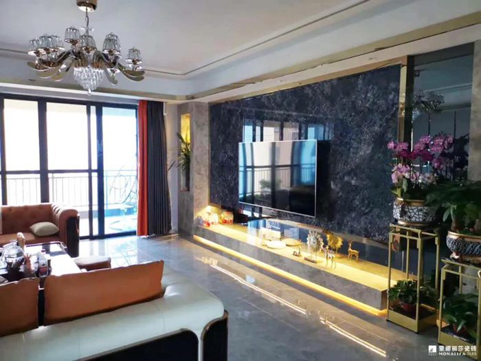 客厅背景墙均采用陶瓷大板铺贴,特别的是七星珍石梦幻宝蓝电视背景墙特显尊贵。