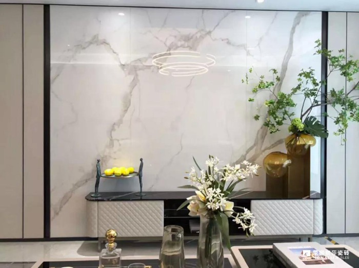 客厅墙地面为两款陶瓷大板搭配,予以简洁线条设计,十分的时尚。