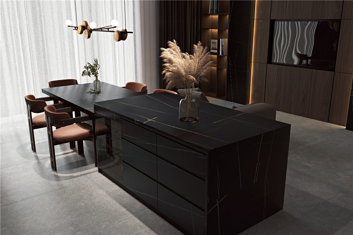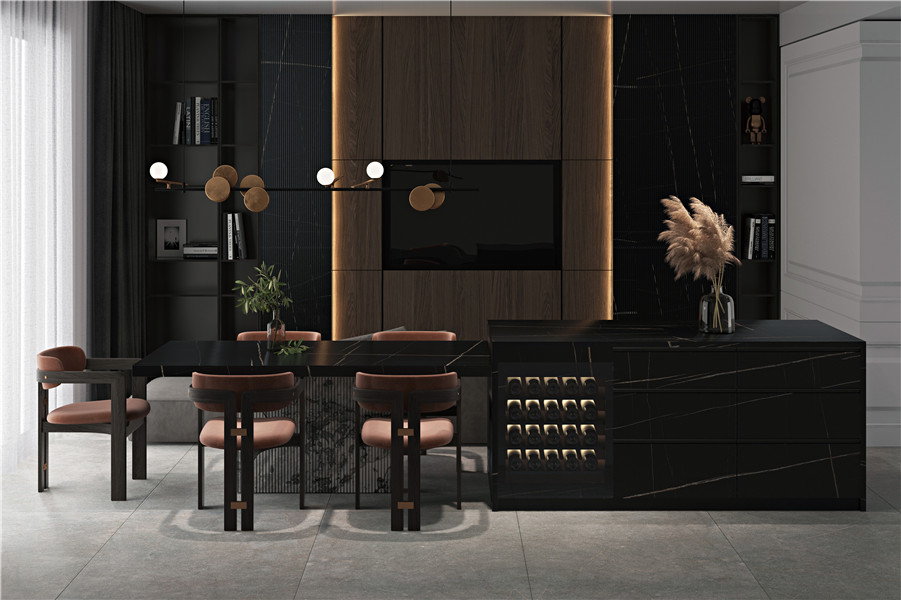 无论是家装空间的家具、厨房、卫浴、墙地面,还是工装建筑的电梯、外墙、地面、前台应用,岩板以强悍的物理性能覆盖了空间一体化应用。同时,岩板可根据装饰需要设计多种不同表面纹理,石材面、木纹面、墙纸面、布纹面、金属面、纯色面等各式装饰风格,加上其卓越的功能特性可使其无缝穿插于不同空间领域的广泛应用。