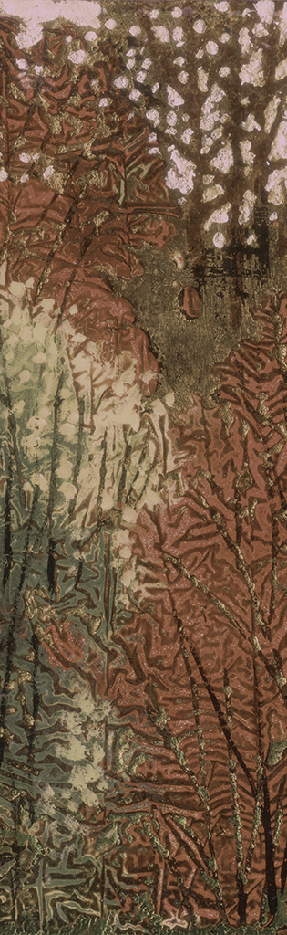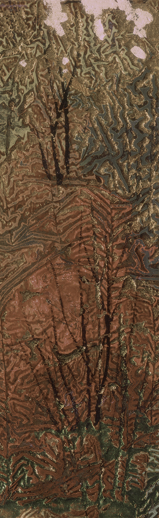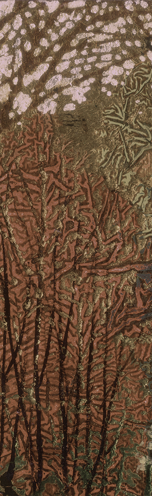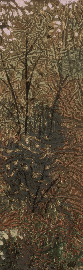 通过两千年前祖辈们原创的漆画符号,吸收了自意大利文艺复兴以来的人类艺术成果,以“树”古代文字的形体符号,取其自由生长的状态加以打磨,高大的树木枝桠密布,力与美的融合,呈现抽象树的肌理效果,表现出线的韧性与力度感,刻画出生命在抽象背景的洪荒宇宙中所焕发的勃勃生机。