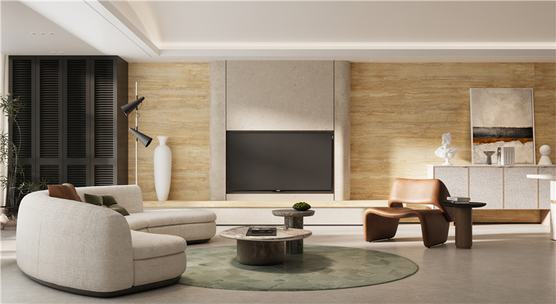源于破晓时分岩层折射的第一缕光,黄金洞石以暖金色为基调,细腻的脉络与疏朗的孔洞宛如被岁月打磨的鎏金痕。砖面流淌着温和的辉光,既有天然石材的野性质感,又透出低调的奢华气韵
