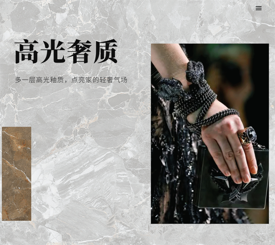 总体以大理石、水泥、木纹、皮纹等材质质感为基地,干粒自然面、亮光面、精雕面三种质感,巧妙融合“个性化”与“实用性”的双重定位,在传承经典与凌驾潮流之间找到平衡点。