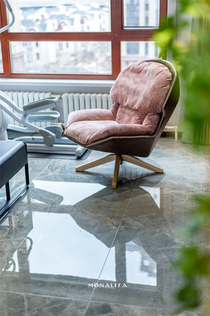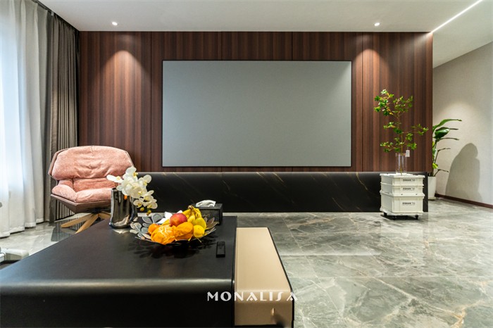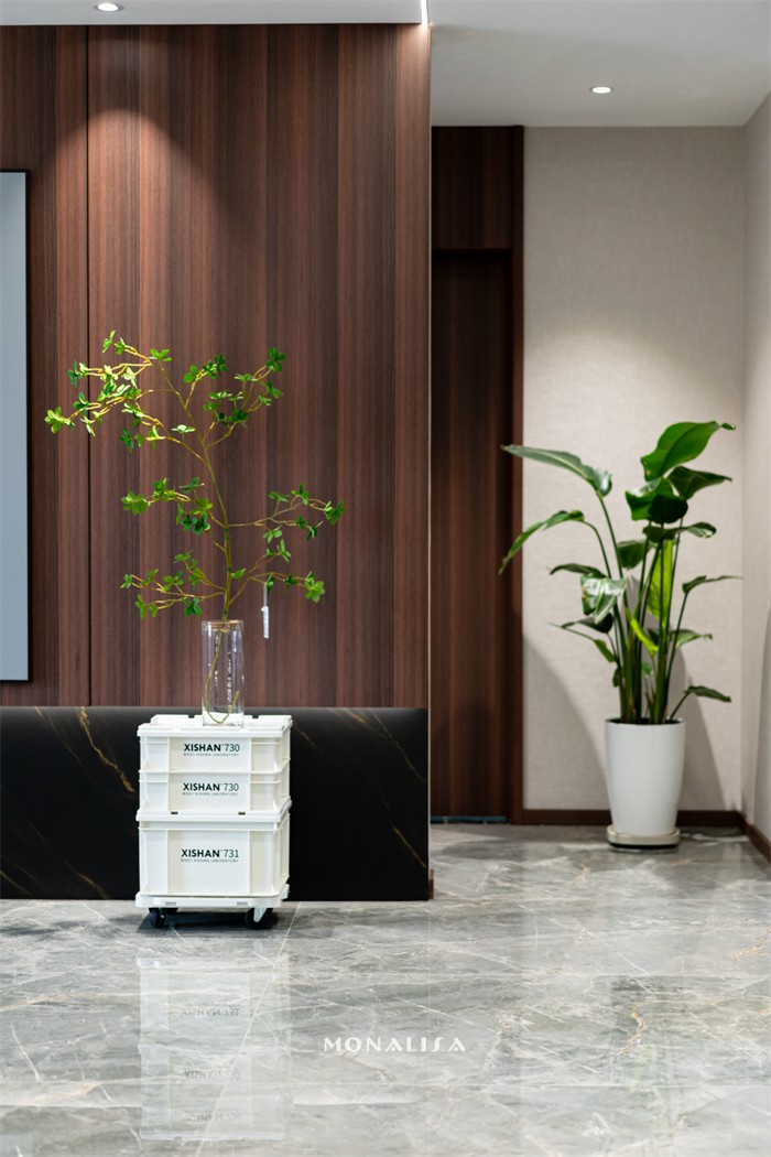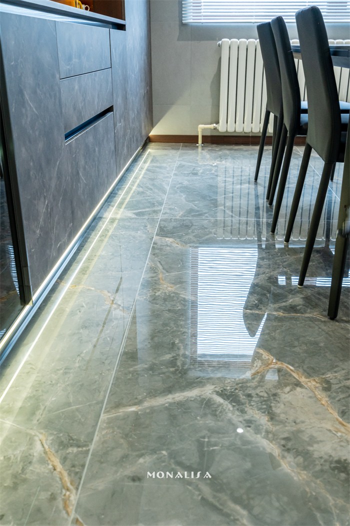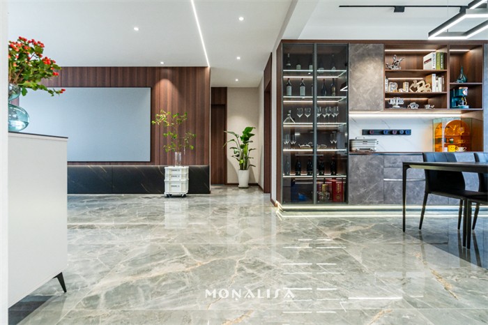 另一视角,又是另一番风景。宛若水波般肌理延绵的蒙娜丽莎-卡地亚灰陶瓷大板通铺地面,大气磅礴的金色条纹,在细纹密布的灰砖上悄然渲染而开,彷如流年碎影,塑造干净而利落的空间。