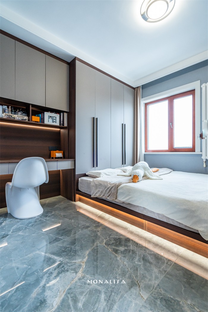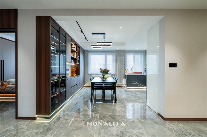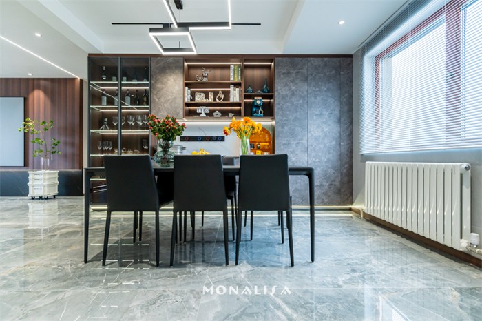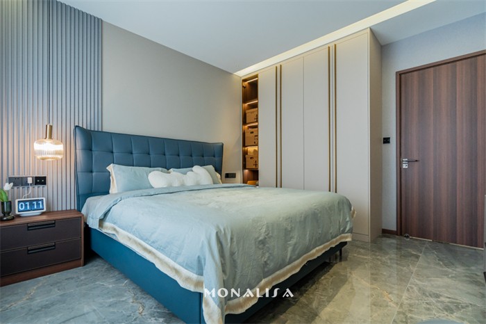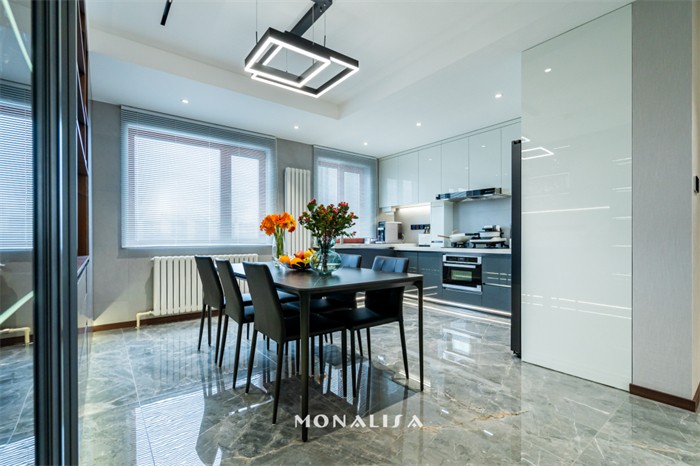地面采用客厅蒙娜丽莎同款陶瓷大板,细腻的石纹肌理释放出温煦的自然美感,简洁而富有现代性,展现了低调奢华的极致品质。