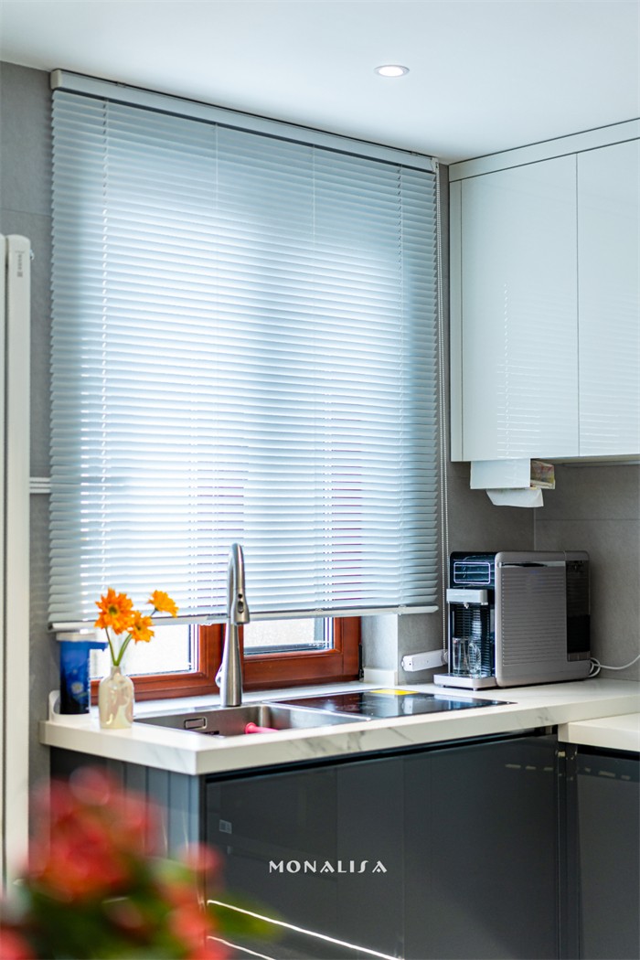 厨房U型橱柜布局,空间利用率高。厨房呈现极简的灰白色调,内嵌的厨房电器与灰色橱柜,满足了厨房基本使用功能。蒙娜丽莎卡地亚灰陶瓷大板丰富随性的自然肌理,深与浅相互交织,不需要过多的色彩也能营造空间的层次感。