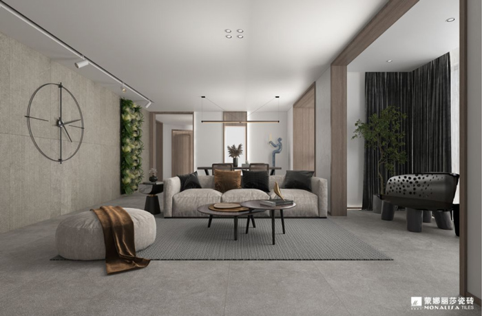 捕捉天然砂石的质朴形态,粗犷又不失浪漫,厚重大气且立体感强烈。大面积铺贴将质感和色彩赋予空间,成就了深邃的典雅气质。