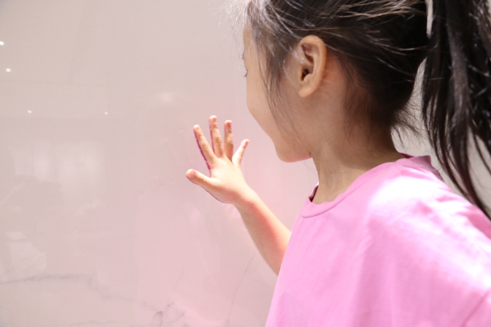 孩子一看,这么好看有质感的瓷砖铺贴在墙面上,还得知可以在这上面涂鸦,就立马跑去拿她的宝贝蜡笔了。我知道,在这里,将开始孩子的开心涂鸦之旅!